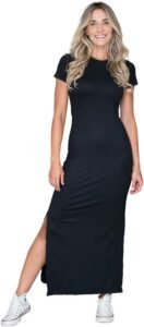 Vestido Preto Longo Casual Canelado, Manga Curta com Fenda, Tecido Elástico, Meia Estação