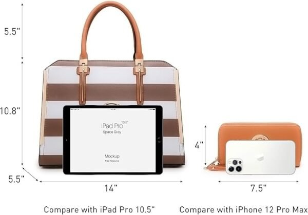 - Dimensão: Tamanho da bolsa – 35,5 cm x 27,4 cm x 14 cm. Tamanho da carteira – 19 x 10 x 2,3 cm. Comprimento da alça superior: 16,5 cm. Alça de ombro ajustável e destacável: 114 cm. Cabe em laptops de 13 polegadas, tablet, documentos etc.